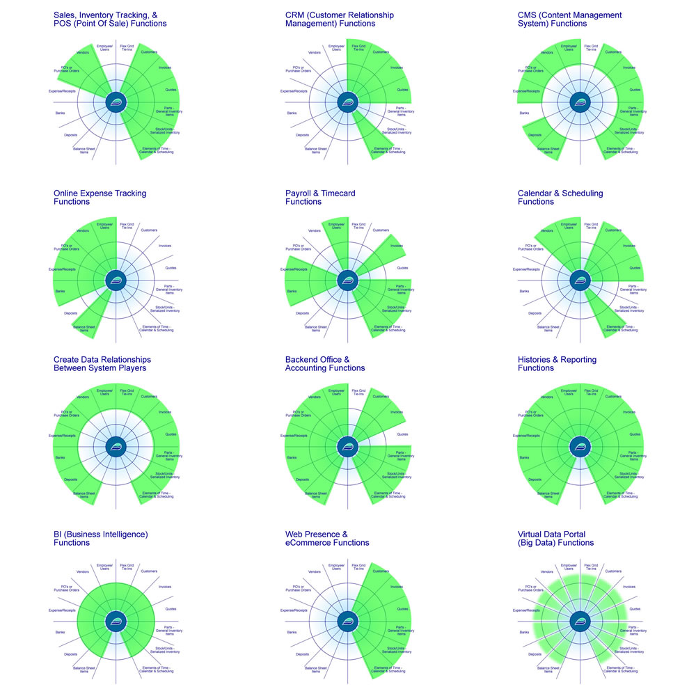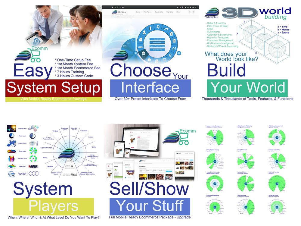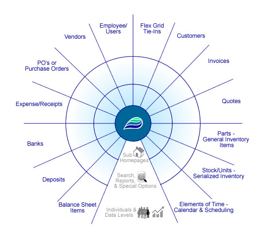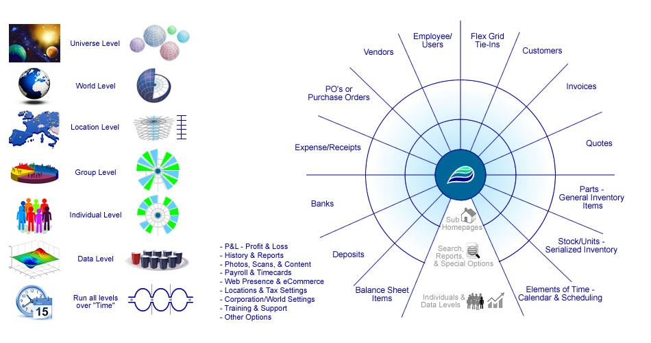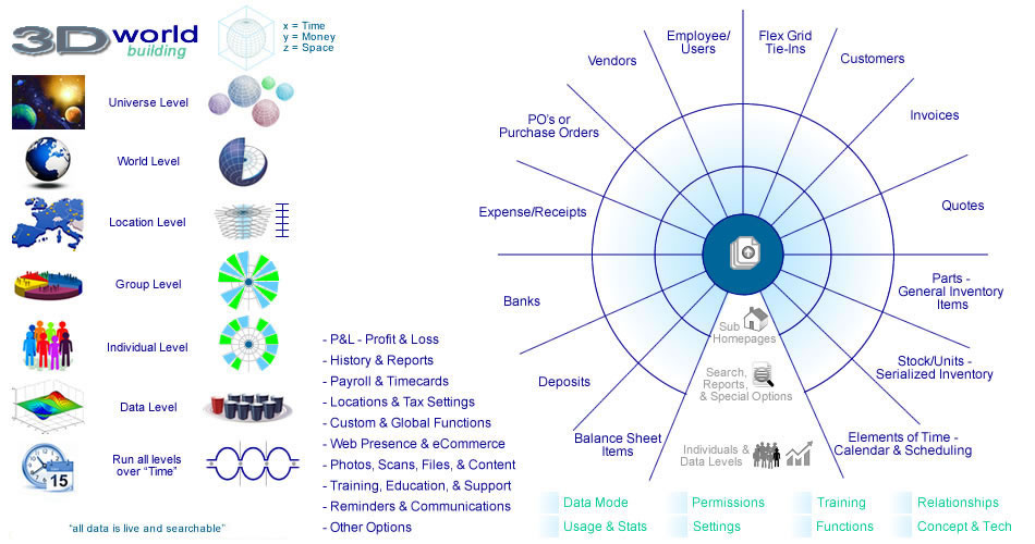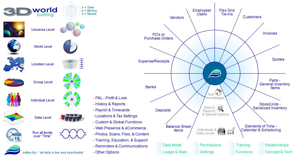 Because the temporary graphic can't show or talk to you yet, we have added a few key point here to help show some of the planning that went in to the interactive map: 1. To start with, each corner piece of the map has been hand selected. These four primary positions contain some of the most diverse elements that we felt were critical to the success of the web application. We have the quick search in the top left corner - which allows you to jump to any place in the system (more...). History and reports is in the top right corner - this is how you get at your data and see what is going on. Tools and maintenance is in the bottom left corner - the entire system deals with a huge toolset and being able to keep things going and flowing. The bottom right corner is web presence and eCommerce. The entire system is web based and deals with providing products and services to your customers. The eCommerce piece is fully functional. We have plans on expanding the eCommerce features to include: a customer bill pay portal, view invoices and quotes (system activity and history), and online reservations. 2. On the bottom of the map is a section for the locations and tax settings. This is shown as a single room (button) but in real life could be as many as are needed. Each item in the system is tied to a location. In a way, the entire model could be added to with multi locations. Think of floors or levels of a building. Each location could virtually become it own floor in this type of analogy. 3. Time or elements of time is another huge base concept for the Adilas system. If you think about it... the entire application is running objects & data over time. Almost every item or sub item has an element of time associated with it. This could be a general date, a due date, a bank date, an action date, etc. This physical section (second long button on the bottom) has been publicly released (round one) but still has a number of updates and functions still under construction (round two and three). More options will be coming soon. See this help file to get more information about elements of time. 4. Both sides have your incoming products and services and your outgoing products and services. On the left you have vendors, payees, on-order, and manufacturing. These are your incoming sources. On the right you have customers and a shopping cart interface. These are your outgoing products and services. The shopping cart interface is specifically very deep and flexible. In a way, almost all of the other pieces hinge on this "interface" between the customers and the rest of the system. For more information about that part of the puzzle, see this help file. 5. The section on the bottom middle is for inventory control and flow. This included purchase orders (PO's), stock/units, the general inventory pool (parts and services), recipe/builds, special line items, and flowing into invoices and quotes. The entire section shows which pieces flow across the system from coming in to going out. Depending on your business, the flow may change, but most likely it will be using these pieces. The inventory tracking is also tied to elements of time and locations and tax settings. The entire bottom section is the operations of the business and things change here from day-to-day. 6. The middle section deals with more time and concept pieces. You have a virtual waiting room for vendor/payees. This is your accounts payable (who you owe money to and how long they have been waiting to get paid). On the other side you have a customer waiting room which is your accounts receivable (who owes you money and how long you have been waiting for payment from them). These values end up becoming part of your companies financials. Both sections are fully automated all the way through the process. 7. In the very middle you have two main concepts. This is the heart and soul of the application. One is objects and data over time and the other is users. Objects and data over time is what the entire Adilas business platform is built on. We are physically building multi sided objects and running them over a life cycle or timeline. This is how we create a virtual road map of what is where and how long it has been there. This time based model also provides a virtual look-back as to where was I and where am I going or headed in the future. Imagine a physical road with tons of motorcycles, cars, trucks, SUV's, busses, trains, planes, UFO's, etc. all doing their thing. Each object is tracked over time and the system keeps track of where it is and where it is going. This becomes a concept we call roll call accounting. Basically, it is the story behind the numbers and what happens over time. The other part of this is the users. A user is the only piece greater than a corporation or business entity. The reason a user is greater than a corporation is because they (you and me) can actually play in multiple corporations or business entities. They are the movers, shakers, and players in the system. They move, do, use, and make the system work. 8. Moving up to the top middle portion of the map, you start getting into a number of accounting and management concepts. On the left you have banks, expense/receipts (money going out), splits (payments on account), rei's (reimbursements or money owed to others), and deposits (money coming in). This is your banking and money flow portion. Most times that you are paying out money, you will be using either vendors/payees or user/payees. This could also include payroll and timecards. The deposits (money coming in) comes from invoices, sales, invoice payments, and accounts receivable payments. You could also have investments or other in flowing monies that would need to be tracked in the company financials. 9. The row second from the top is the financial part of the business. Here you are dealing with cash flow, banks, profit and loss (P&L), income statements, and the balance sheet. Similar to cream rising to the top, virtually everythi